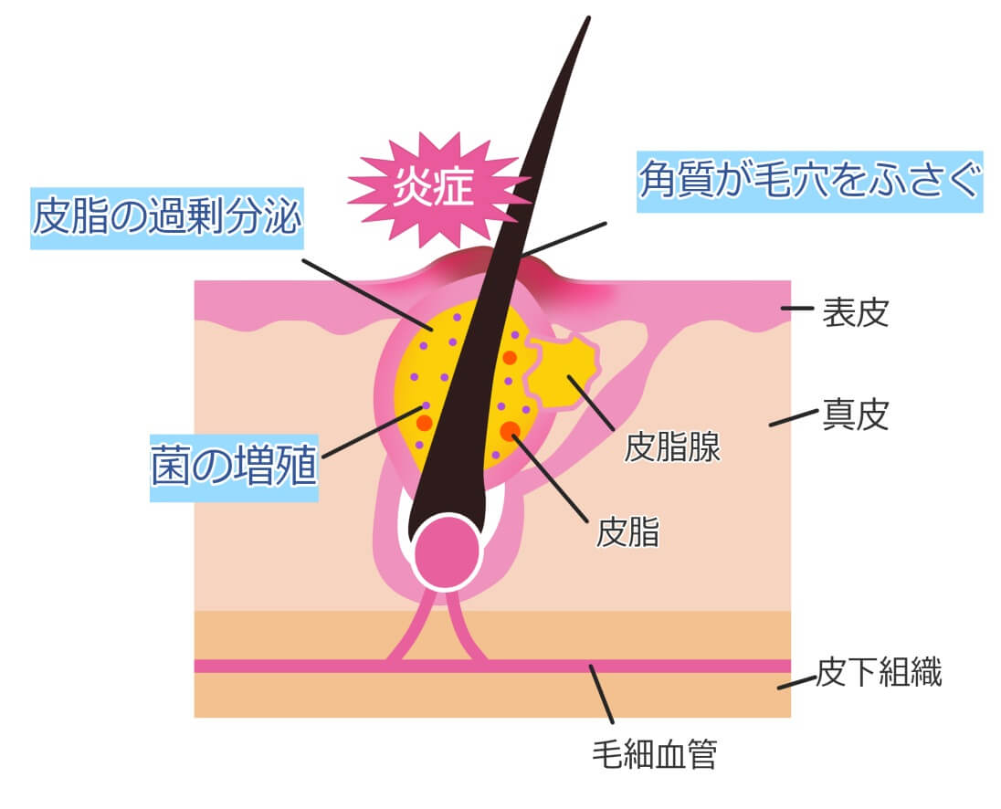 ストレスや睡眠不足などによってホルモンバランスが乱れると、皮脂の分泌量が多くなりニキビの原因になります。また、生活習慣の乱れは、肌の炎症を悪化させてしまいます。