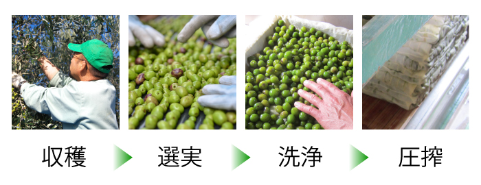 当社では、オリーブ果汁を搾るときは伝統的な圧搾法を採用しています。