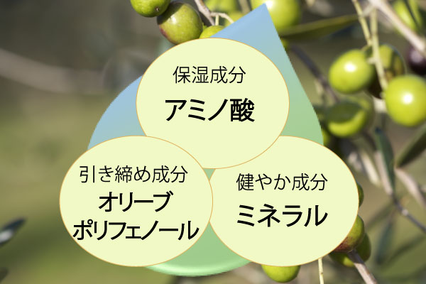 研究の結果、オリーブ果汁はポリフェノールやアミノ酸を含有しており、適度に肌を引き締めながら、肌の乾燥や肌荒れを防ぐことが分かりました。