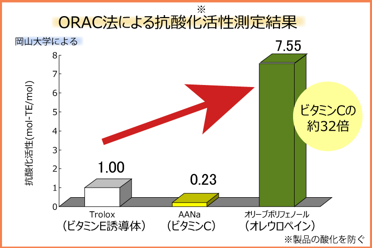 さらに研究を進めていくと、オリーブポリフェノールには、水溶性の抗酸化成分※として有名なビタミンCの約32倍の抗酸化活性があるという研究データも出ました。