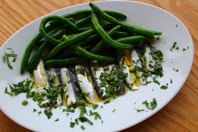 ③ ワインビネガー、エキストラバージンオリーブオイルでもみ込み(いんげんに塩味が足りなければ、塩も入れる)、ままかりの横に盛り付ける。