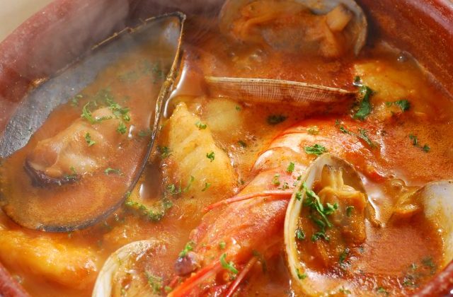 カタルーニャの軽歌劇「サルスエラ」のように、地元の魚貝類オールスターそろった、サフランとアーモンドとトマト風味のスープ。
