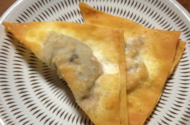 ①餃子の皮に、ピーナツバターを小さじ1/4程度、あんこを小さじ1/2程度入れて包みます。