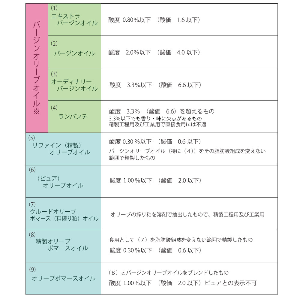そもそも、IOCは酸価・酸度・風味などにより、前述のように9種に細かく分類しており、「エキストラバージンオリーブオイル」はこの9つに分類した最上級のオイルの呼称です。