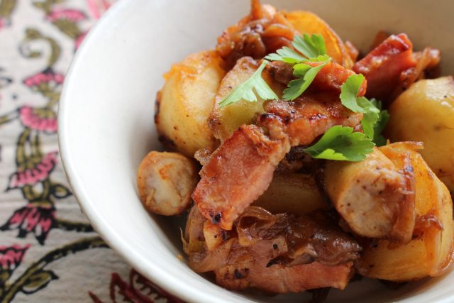 「厚切りベーコンとソーセージ、じゃがいものソテー リヨン風」です。