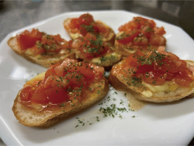 ⑥ 焼きあがったらトマトをのせ有機栽培エキストラバージンオリーブオイル シングルを追いかけして完成。