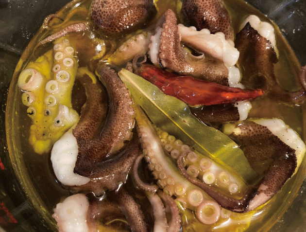 ⑤ 蛸の色が変わって、火が通ったら出来上がり。冷めても美味しく、残ったオイルはパンやパスタに利用もできます。