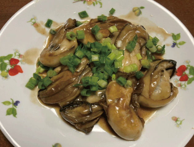 ③ 最初に牡蠣から水分が出てくるので、その水分が少なくなったら、オイスターソースを大さじ1杯加えて、絡めたら皿にとる。あらかじめ用意していたねぎを振りかけて完成♪
