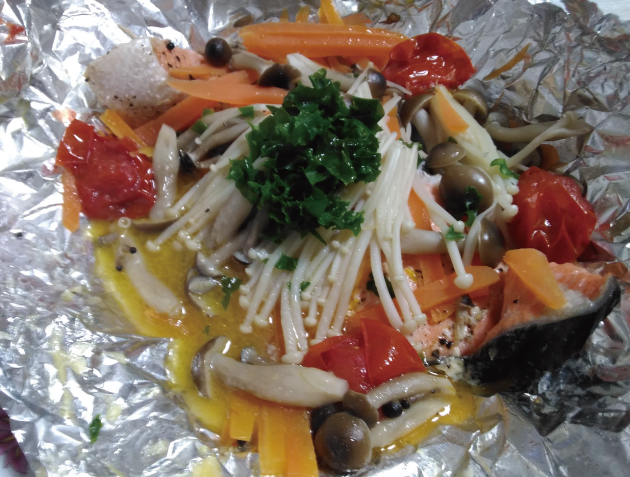 ① アルミホイルにエキストラバージンオリーブオイル トルトサを敷き、鮭、ニンジン、エノキ、しめじ、プチトマト、ケール、バターを順番に載せ、中火で約8分蒸し焼きにする。