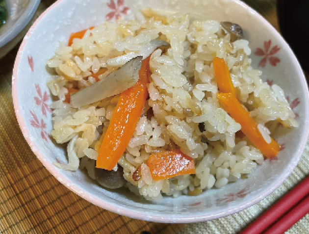① 人参は千切り、ごぼうはささがき、しめじは石づき落として小房に分ける。油揚げは1 センチくらいの大きさに切る。
