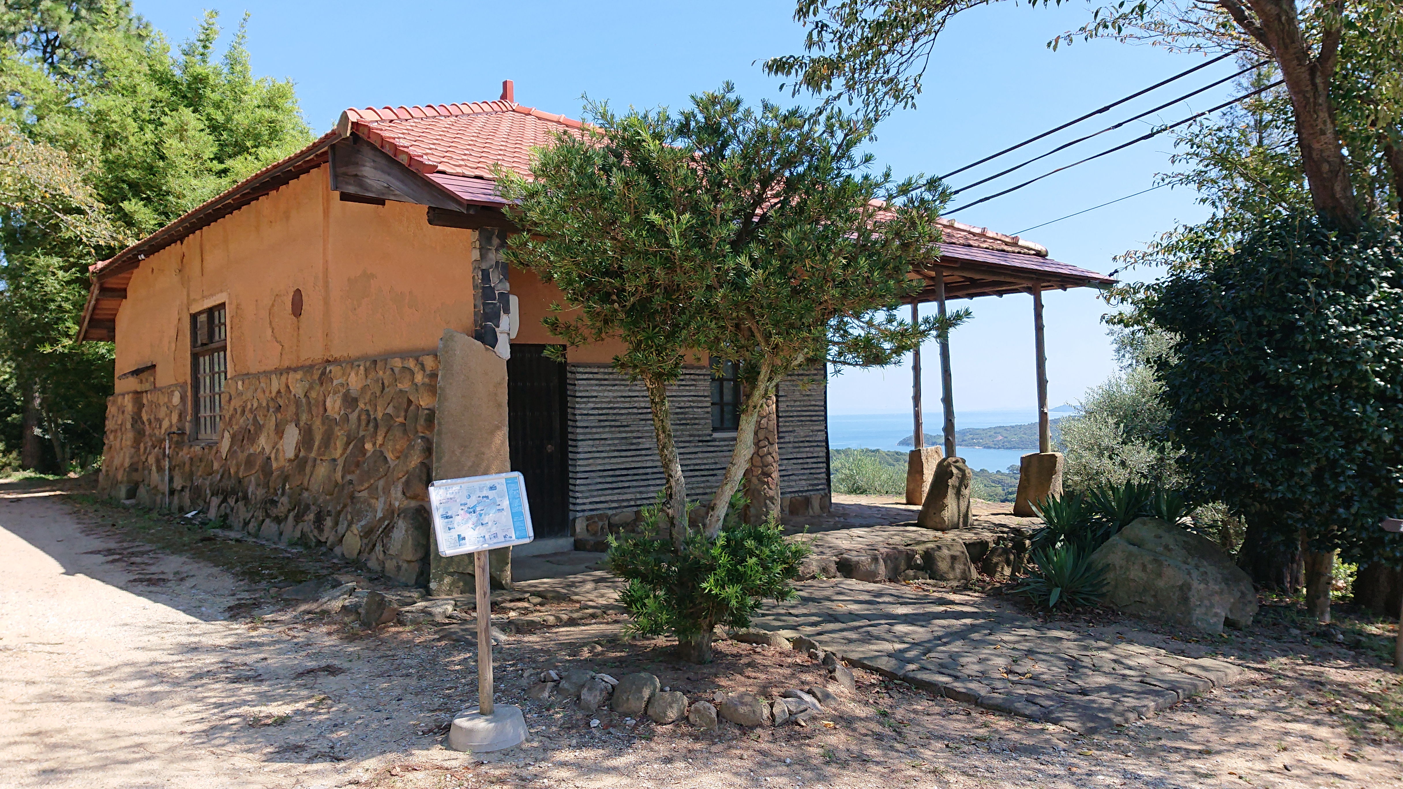 山頂広場の遠くの島まで見渡せる空や海の印象の強い爽快な景色や、家族連れやイベントでにぎやかな雰囲気とは、一味異なり、静かで生き物や植物の気配が感じられる雰囲気のこの場所から見る景色は、視界の下半分は赤屋根の下に広がるオリーブ畑のオリーブの木々に埋められ、その奥に空や海が見える落ち着いた大人の印象です。