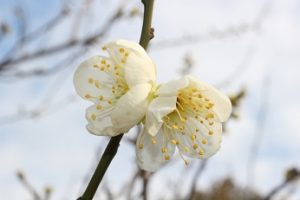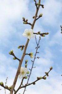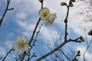 白梅は蕾がふっくらと膨らんで、花が数輪咲いています!(^^)!