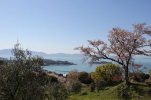 晴天の桜舞い散る4月13日は【牛窓オリーブ園の日】。