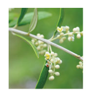 オリーブは5月下旬~6月上旬に花を咲かせます。花は、直径3mmほどの白い小花が房状につき、1つの花房に10~30輪咲きます。1本では自家不和合性が強いため、実をつけにくいオリーブの樹ですが、他品種の花粉で受粉してやればよく結実します。開花、結実は樹高が1mを超える程度に成長すれば始まります。