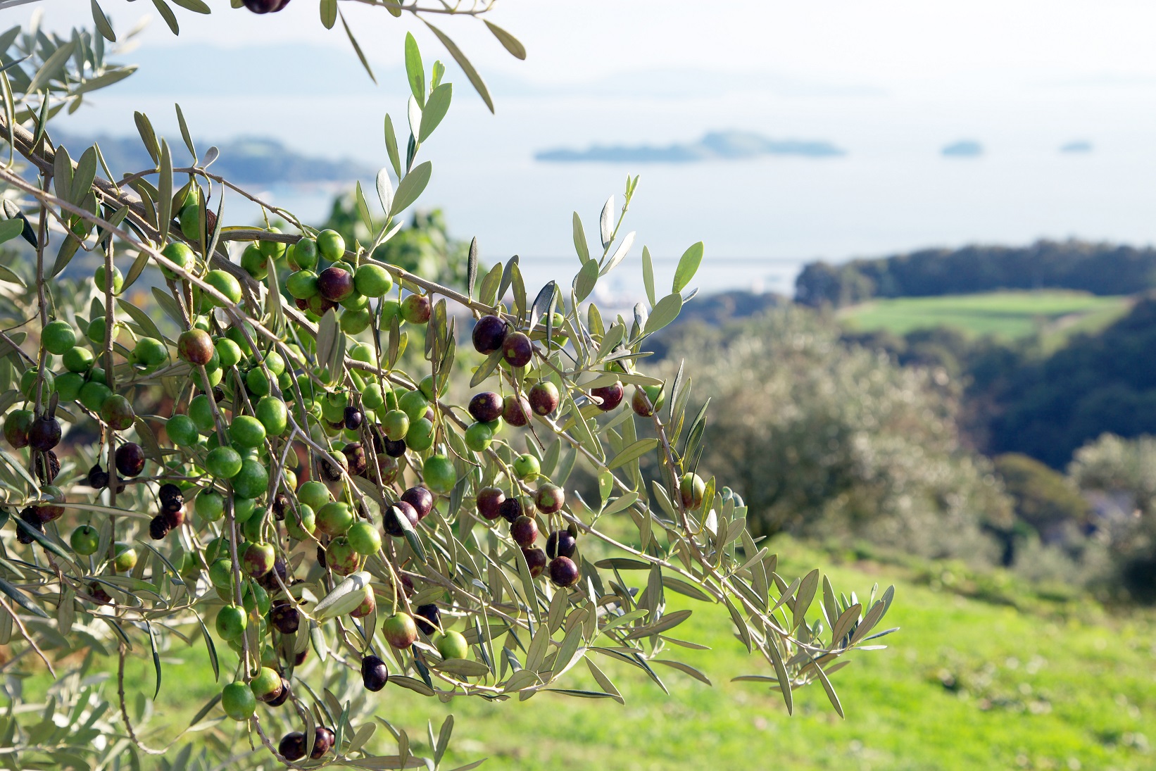 瀬戸内の美しい島々を見渡す丘にある「牛窓オリーブ園」がわたしたちの活動拠点です。約2,000本のオリーブが茂る園内にはハーブ園や幸福の鐘の丘などがあり、家族でくつろげる観光スポットとしても知られています。山頂にあるショップには当店で販売されている化粧品、食品、オリーブの鉢植えなどが並び、展望台からは周囲の景色をぐるりと360度眺めることができます。初夏に咲く白いオリーブの花、秋に色づくオリーブの実、そして年に一度、大勢のお客様でにぎわう収穫祭と、四季折々の表情を楽しんでいただけます。