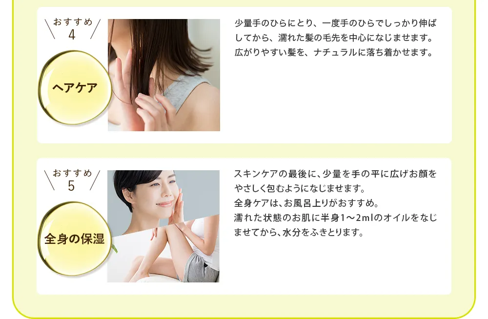 スクワランにくらべると多少ベタつく感じが否めませんが、日本オリーブさんのオイルが一番肌になじみます。年齢問わず様々な場面で全身に使えて重宝するので、日常使いのかばんのほか家族各自の非常用リュックにも入れています。 |