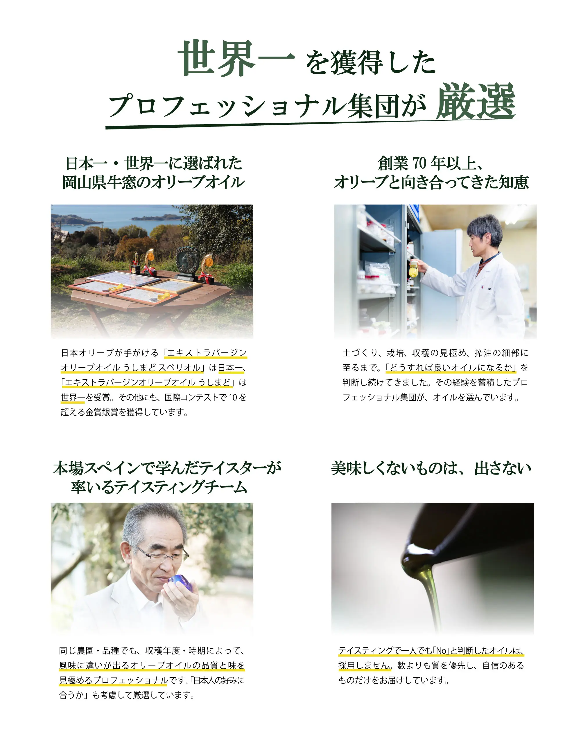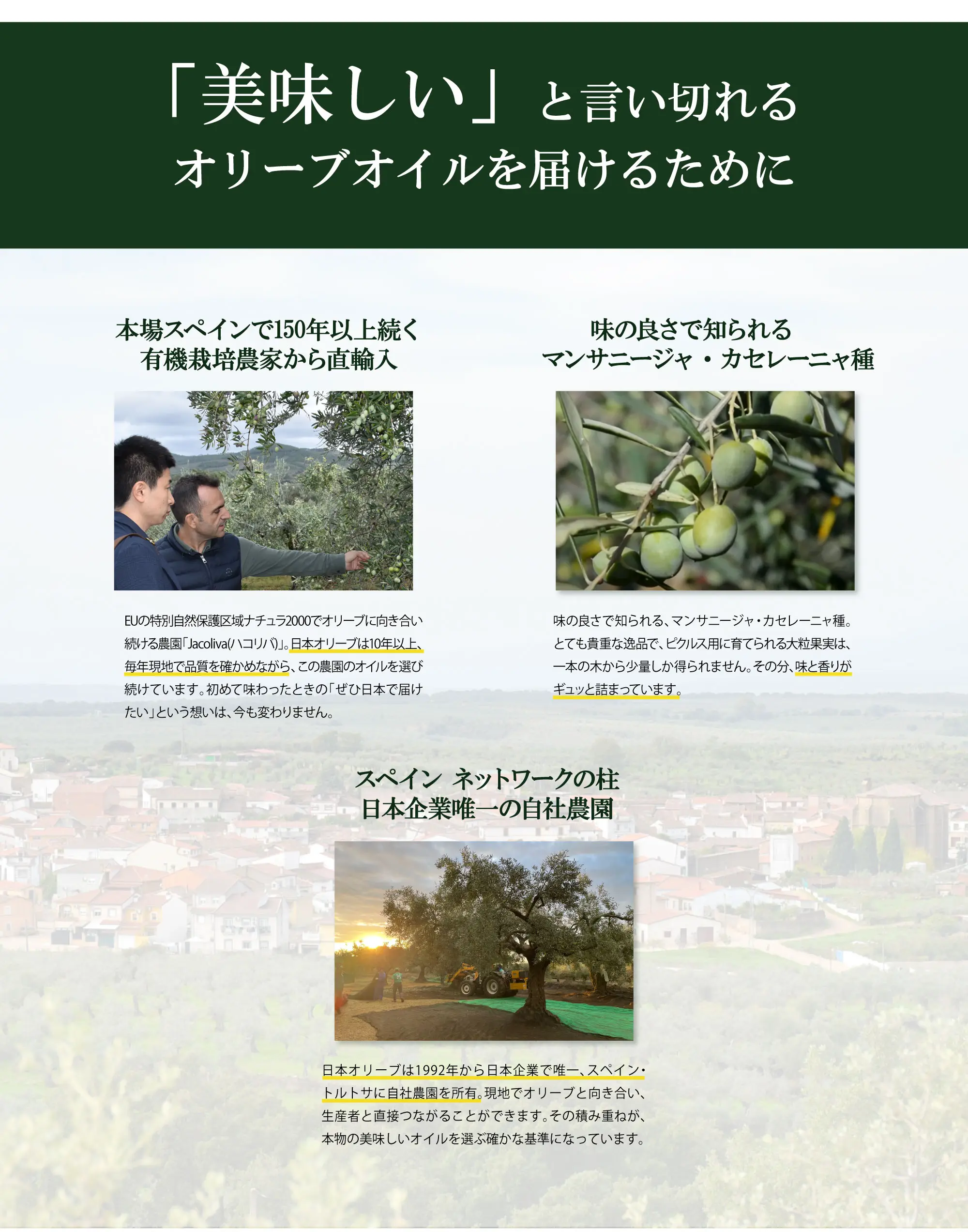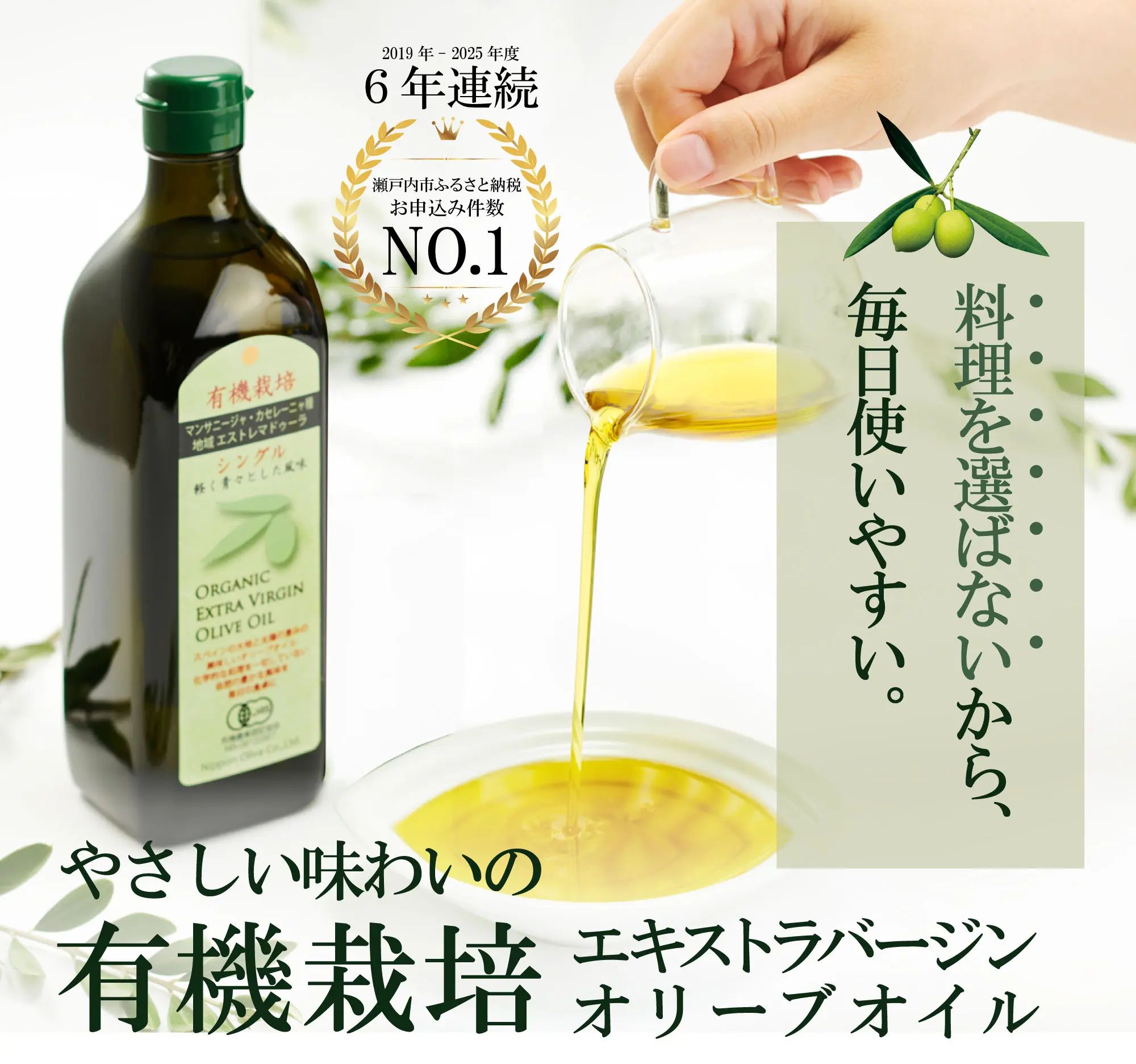 このWEBページはオリーブオイルをはじめ、オリーブ化粧品の日本オリーブ公式通販サイトです。 希少な国産(自社農園産)エキストラバージンオリーブオイルや、本場スペインにある自社農園産のエキストラバージンオリーブオイルを限定販売しています。 また、オリーブのプロが厳選したオリーブオイルを使用したドレッシングやフレーバーオイルなども購入いただけます。 原料の選抜、その設計からひとつひとつ研究を重ねたシンプル処方のオリーブの化粧品を製造しています。 オリーブオイルだけでなく、オリーブの葉、オリーブ果汁・オリーブスクワランなど、オリーブ由来の潤いの恵みをたっぷり使用しています。 日本オリーブWEB通販スタッフのおすすめ商品は、創業以来60年以上愛され続ける「化粧用オリーブオイル」と、自宅でも簡単に育てられる「オリーブの苗木」、さらっとのびてべたつかない家族全員で使える「シコリーブ 薬用スキンクリーム」です。 「化粧用オリーブオイル」は、長年ご愛用のお客様から口コミで広がり、「これからもずっと愛用していきたいと思います」「使い始めて約30年近く経ちます」と評判です。 比較的長くご愛用いただいているお客様が多いのが、とてもうれしいイチオシ商品です。 日本オリーブの売上数量ランキングは、【1位】オリーブマノン 「化粧用オリーブオイル」、【2位】エキストラバージンオリーブオイル 「トルトサ」、【3位】オリーブマノン 「グリーンローション(果汁水)」です。 化粧品に関しては、当公式サイトでの購入に限り、30日間の返金保証(返品保証)も実施しています。 一部商品(苗木・予約商品・入荷待ち商品)を除き、平日(月曜日〜金曜日)は午後2時までのご注文で即日出荷いたします。 化粧品・食品はギフト包装(ギフトラッピング)&ギフト配送可能、苗木は指定の送り先への配送は可能です。 化粧品・食品は各種熨斗(のし)も無料にて対応します。表書きが不明な場合はご相談ください。 配送については、北海道・沖縄など、離島にもお送り可能です。 岡山県からの出荷になりますので、岡山・広島・関西地方の 大阪・京都・滋賀・奈良・和歌山・兵庫・名古屋(愛知)・三重・岐阜・関東地方の 東京・神奈川・千葉・埼玉などには、最短で注文の翌日着も可能です。 ご購入金額7,000円以上 送料無料 、全国送料一律です。