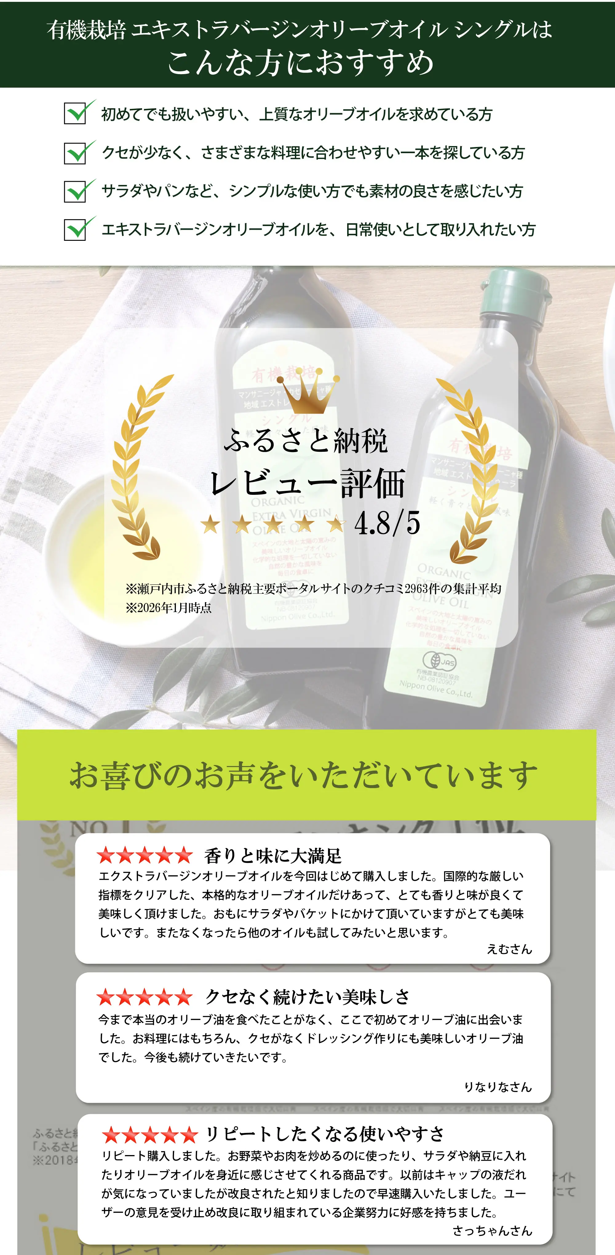 オリーブ化粧品の日本オリーブ公式通販 > 初めての方限定アイテム > テスト◎有機栽培エキストラバージンオリーブオイルシングル 450g(有機JAS認証)