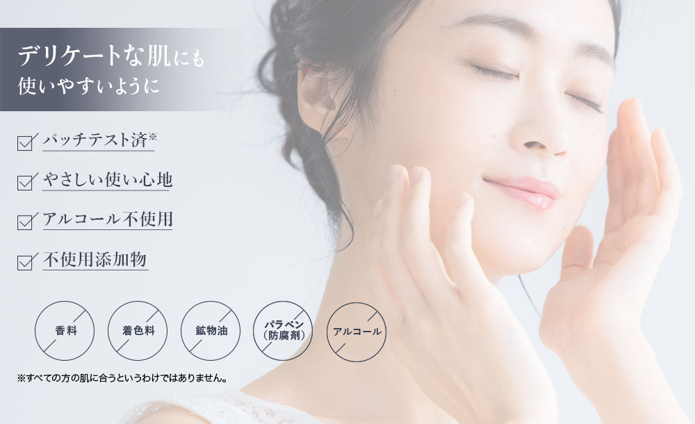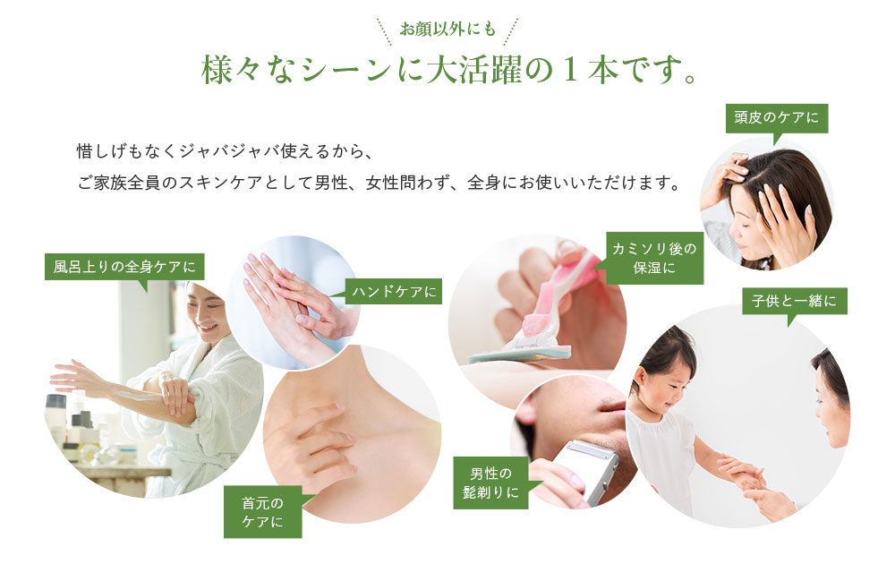 顔はもちろん、全身にも使え、乾燥しやすい手肌や首筋にもなじみやすいと好評です。