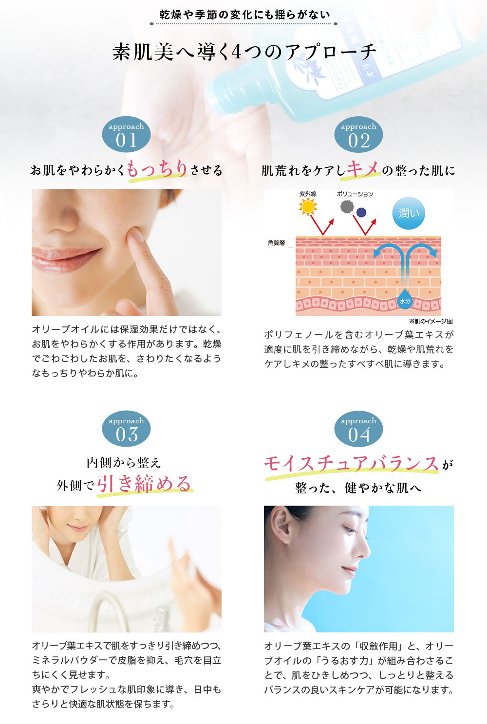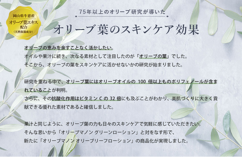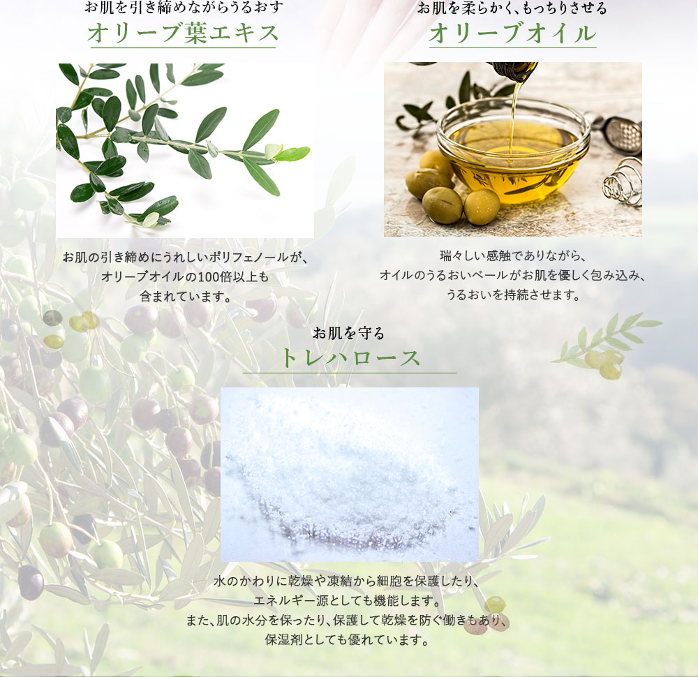 オリーブオイルだけでなく、オリーブの葉、オリーブ果汁・オリーブスクワランなど、オリーブ由来の潤いの恵みをたっぷり使用しています。