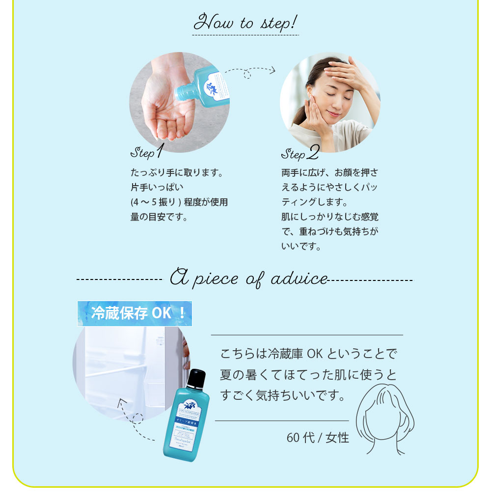 いつもはオリーブ果実水使っていますが、夏はこちらの方がさっぱりしていて良いかもと試しに使ってみたら正解でした。まずスッキリした香りに癒されます。こちらは冷蔵庫OKということで夏の暑くてほてった肌に使うとすごく気持ちいいです。 |