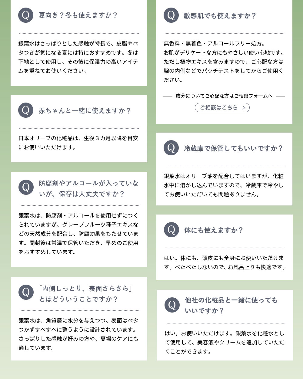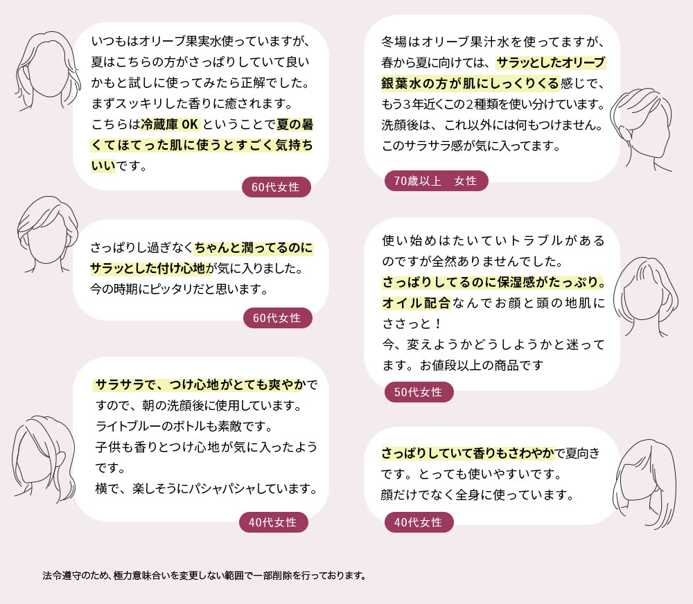 特に夏はオリーブ果汁水から銀葉水に切り替える方も多く、長年愛用しているリピーターも数多く見られます。